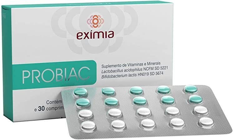 Saiba Mais    Eximia Probiac - Bula Eximia Probiac: Para Que Serve Exímia Probiac é um suplemento com associação de probióticos, vitaminas e minerais indicado para pessoas que sofrem com cravos e espinhas, em sua maioria decorrentes de alterações intestinais. A fórmula de Eximia Probiac auxilia no bom funcionamento do intestino e na melhora da inflamação presente na corrente sanguínea, controlando a produção excessiva de sebo e devolvendo o equilíbrio da barreira cutânea. O resultado é uma pele livre da acne, saudável e bonita. Confira A Ação De Alguns Dos Ativos De Eximia Probiac: Probióticos (Lactobacillus acidophilus e Bifidobacterium lactis): auxiliam no equilíbrio das alterações intestinais e controle da produção sebácea que estão relacionados ao aparecimento ou piora da acne. Zinco: ajuda no tratamento e prevenção da acne e retarda o aparecimento de sinais do envelhecimento. Niacina: possui ação anti-inflamatória, calmante e hidratante, além de fortalecer e manter a barreira cutânea protegida. Também atua como anti-idade. Vitamina a: é responsável pela renovação celular e produção de novas fibras, está relacionada à síntese de colágeno, atuando contra a flacidez, envelhecimento e marcas na pele. Como Tomar O Eximia Probiac Ingerir 1 comprimido de probióticos (branco) e 1 comprimido de vitaminas e minerais (verde) uma vez ao dia, ou conforme recomendação médica. Composição Comprimido branco: Associação de 2 probióticos: Lactobacillus acidophilus + Bifidobacterium animalis ssp. lactis. Comprimido verde: Vitaminas a, B6 e Niacina e Minerais Zinco e Cobre em 100% da idr. Alérgicos Não contém glúten, lactose e açúcar. Advertências Este produto não substitui uma alimentação equilibrada e seu consumo deve ser orientado por nutricionista ou médico. Gestantes, lactantes e crianças de até 3 anos somente devem consumir este produto sob orientação de médico ou nutricionista. Não ingerir se você possui hipersensibilidade (alergia) a algum dos componentes da fórmula; Não exceder a recomendação diária; Conservar em local seco e arejado, protegido da luz e da umidade; Manter fora do alcance de crianças; Sempre seguir as instruções de uso. As informações estão sujeitas a alterações. Sempre verifique a embalagem antes de consumir.